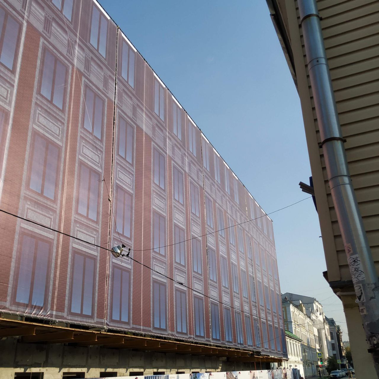 Монтаж фальшфасада выполнялся с применением специализированного оборудования и технологий промышленного альпинизма.